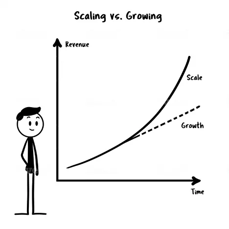 Most people tend to confuse growth for scaling. However, growth in a startup is not the same as scaling. Growth primarily refers to the increase in one or more aspects of a business, such as revenue, customer base, or market share. It can involve incremental progress or expansion without necessarily altering the fundamental structure or operations of the business. For instance, a startup experiencing growth might see a steady increase in its customer base due to effective marketing strategies or the introduction of new product features. While this growth is positive, it doesn't necessarily imply a proportional increase in efficiency or resources.