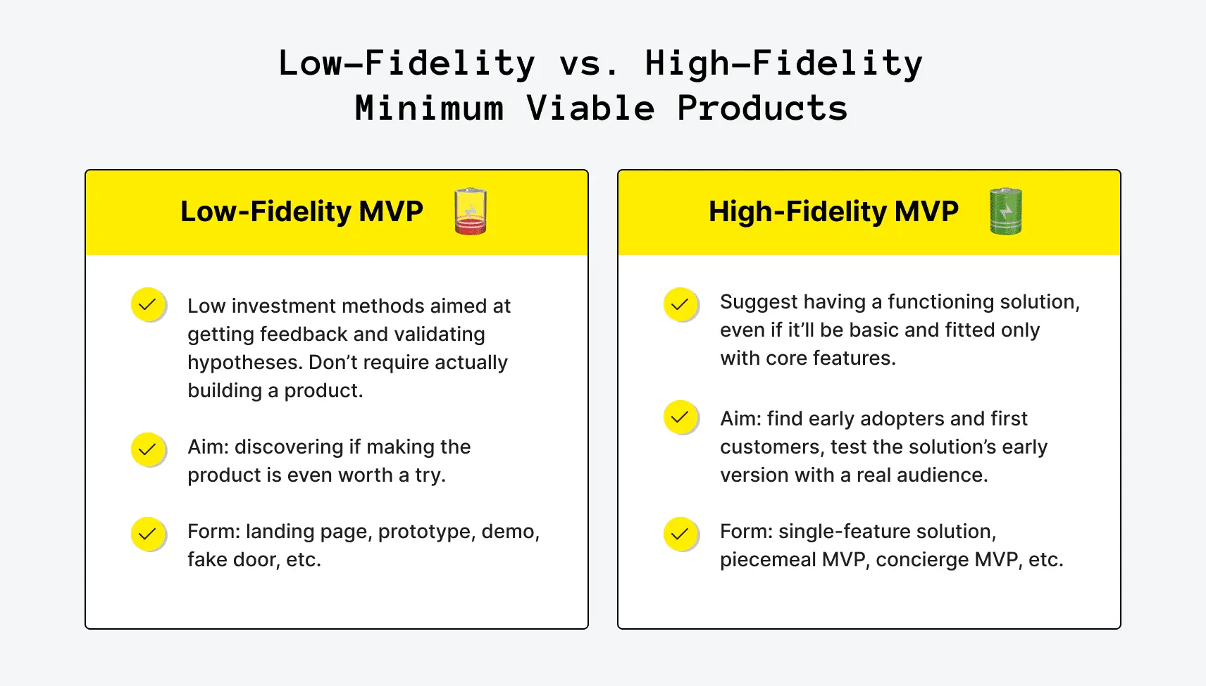 There are two major classifications for MVPs- Low Fidelity MVPs and High Fidelity MVPs. A low-fidelity MVP serves as a fundamental exploration to assess the market demand for your concept. An illustration of this could involve a rudimentary paper sketch outlining the essential features of your mobile app. On the other hand, a high-fidelity MVP represents a more sophisticated approach, focusing on gauging users' willingness to pay for your product. An instance of this might be a single-feature MVP, such as an online food ordering app that exclusively allows users to place orders from various restaurants.